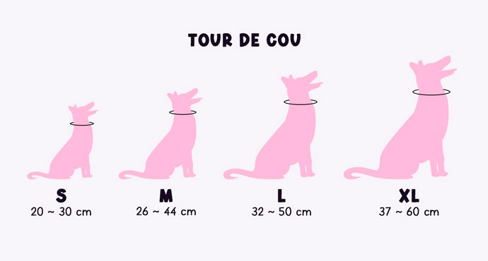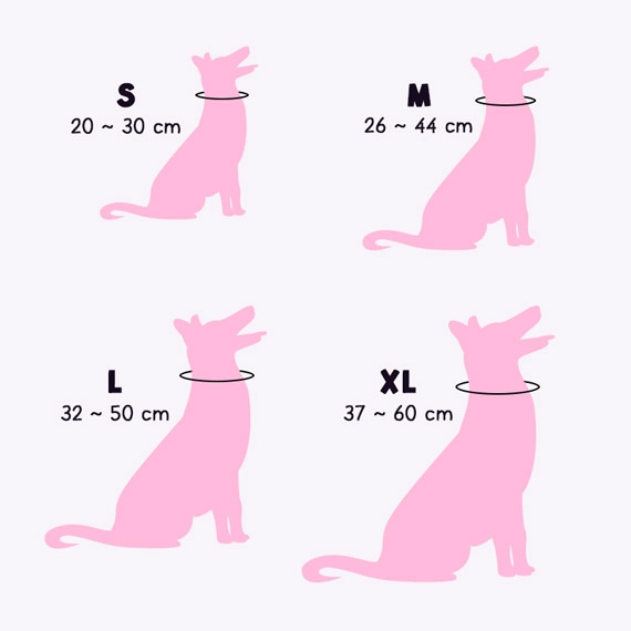| Dimensions | Tour de cou : S = 20 ~ 30 x 1 cm | M = 26 ~ 44 x 1,5 cm | L = 32 ~ 50 x 2 cm | XL : 37 ~ 60 x 2,5 cm |