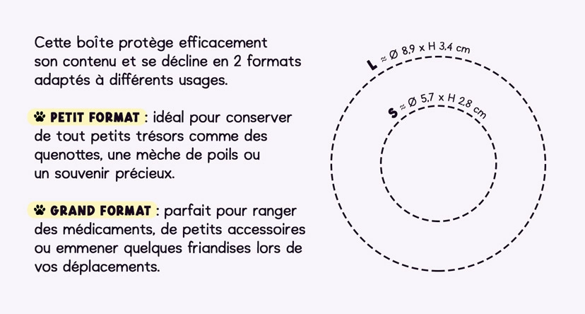 | Dimensions | S: extérieur Ø 5,7 x H 2,8 cm, approximativement | L : extérieur Ø 8,9 x H 3,4 cm - intérieur Ø 7,7 cm |