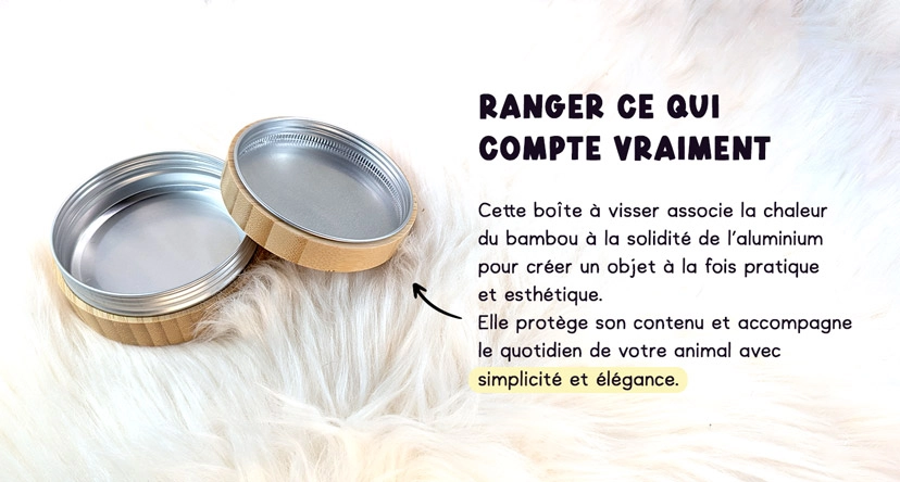 Parfaite pour garder à l'abri ses médicaments et compléments. La boîte est composée d'un contenant en aluminium, protégé par une coque de bambou. Le couvercle se visse pour une conservation et une protection optimale de ses traitements.