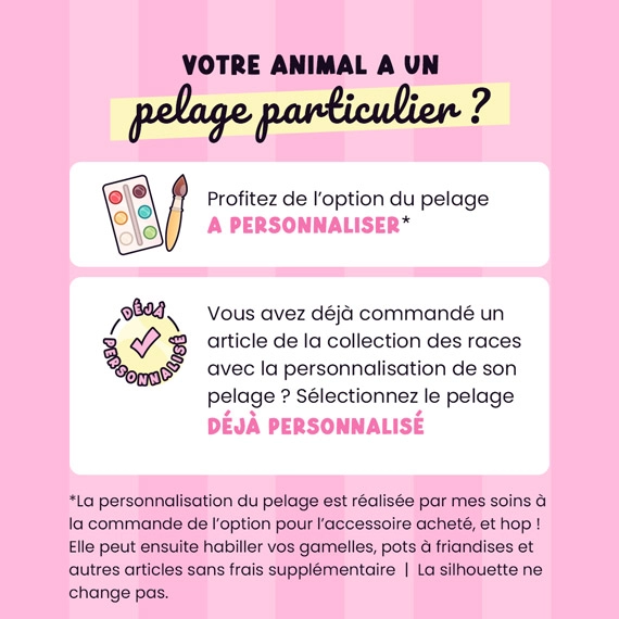 Personnalisez le pelage en sélectionnant le modèle à personnaliser. Envoyez une photo de votre chien pour qu’il soit unique et à son image.